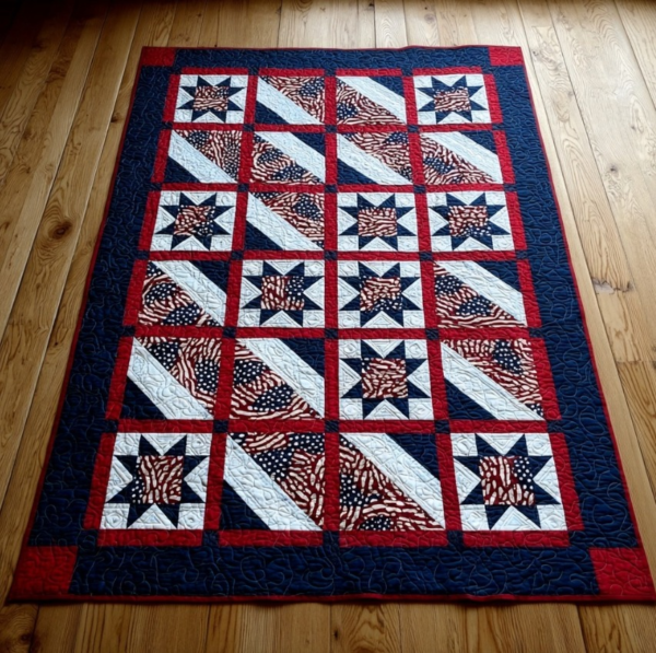 The vibrant interplay of red, white, and navy echoes a deep-rooted heritage, while the sharp star points and angled stripes breathe life into a modern quilting narrative. This quilt speaks not just of tradition, but of strength, individuality, and remembrance.