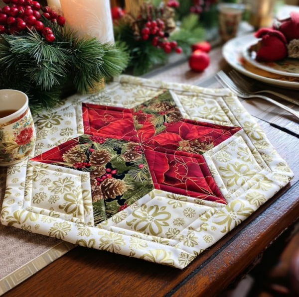 Bring the warmth of the season into your home with Candlelight Star, a handmade quilted table topper that shines with festive elegance. Designed in a radiant star pattern, it blends deep crimson poinsettias, evergreen sprigs, and pinecones with golden floral accents that shimmer like candlelight.