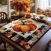 The triangle edges mimic falling leaves, while the swirling quilting patterns echo crisp autumn breezes. Gingham prints, spooky florals, and scattered stars make this piece feel both festive and cozy perfect for setting the scene at your Halloween table or autumn gatherings.