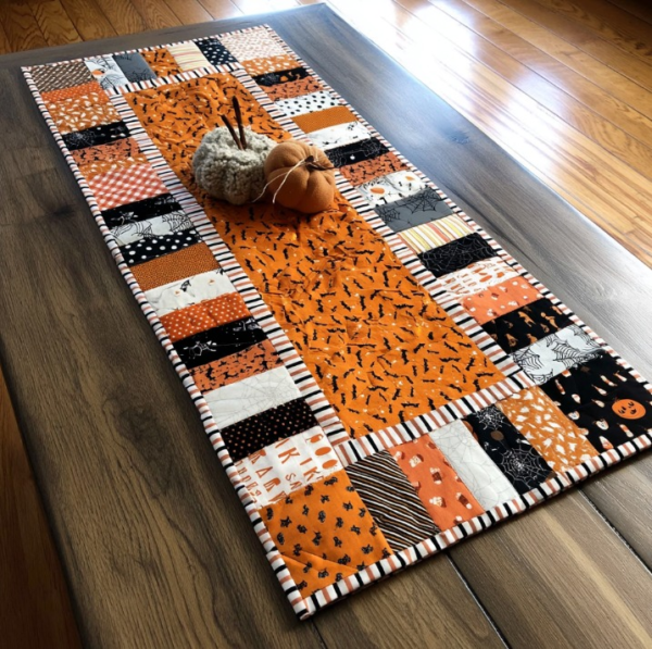 “Witch Way” is a whimsical, modern Halloween quilted table runner that blends the charm of spooky season with handmade magic. Designed with playful pops of pumpkin orange, ghostly white, and midnight black, this piece features bats in flight, cobweb corners, candy stripes, and charming pumpkins stitched into a festive path full of personality.